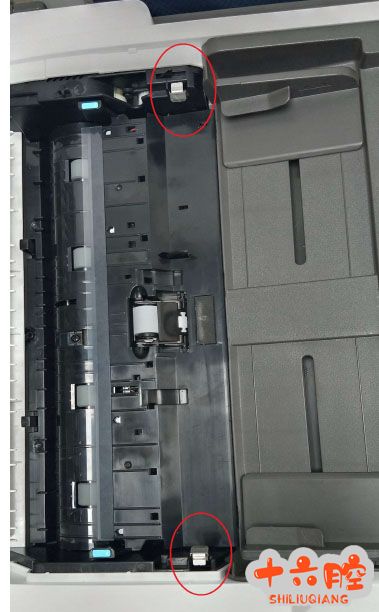 理光MC2000 机器送稿器方式复印时,送稿器搓纸轮空转异响导致卡纸 诊断过程 1) 清洁送稿器搓纸轮和分离辊/垫,故障依旧。 2) 检查清洁原稿送纸传感器和原稿设置/反转传感器,故障依旧。 3) 检查送稿器进纸驱动电机,未见异常。 4) 因出故障时有轻微异响,类似送稿器搓纸驱动部打滑空转声音,故用力压住送稿器左盖后复印测试,故障解决。 5) 检查送稿器左盖发现仅靠自然关闭,送稿器左盖不能完全关严,但机器不会提示左盖打开。调整送稿器左盖锁止金属弹片(下图红圈处)后,左盖关严,送稿器复印正常。