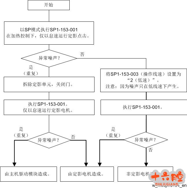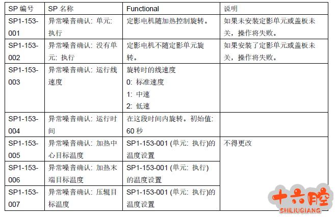 症状: 机器在运行阶段出现异响。初步判断为机械部件运行而发出的噪声而非电器噪声。 分析原因: 机器运行时可能产生噪声的部位很多,可用分部位、分组件的方式排查。5-804可以检测电机、离合器等执行件的动作,另外机器也提供了其他检测部件运行状态的方式。 本案例以定影部为案例,排查定影单元是否为噪音源。可利用机器自带的检测手段SP1-153代码及其子项检测。
