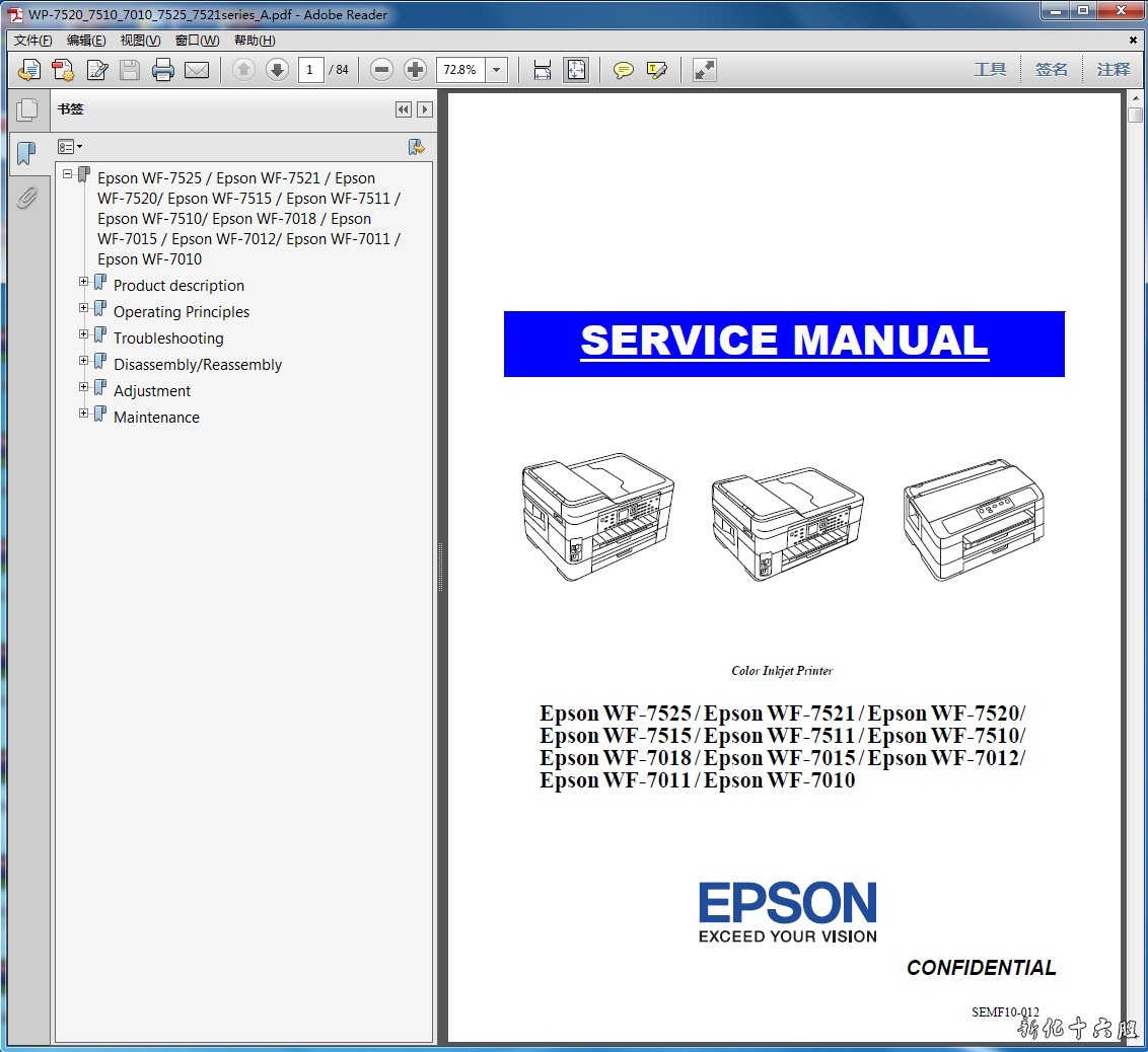 爱普生WF- WF7525 7521 7520 7515 7511 7510 英文维修手册 资料语 言:英文页 数:84页格 式:PDF无加密手册内容详实,图文并茂,是维修人员的好帮手,有了维修手册,这款机子的拆卸、故障排除您就不用再发愁了!即使是普通的用户,也可以根据维修手册解决简单的故障。