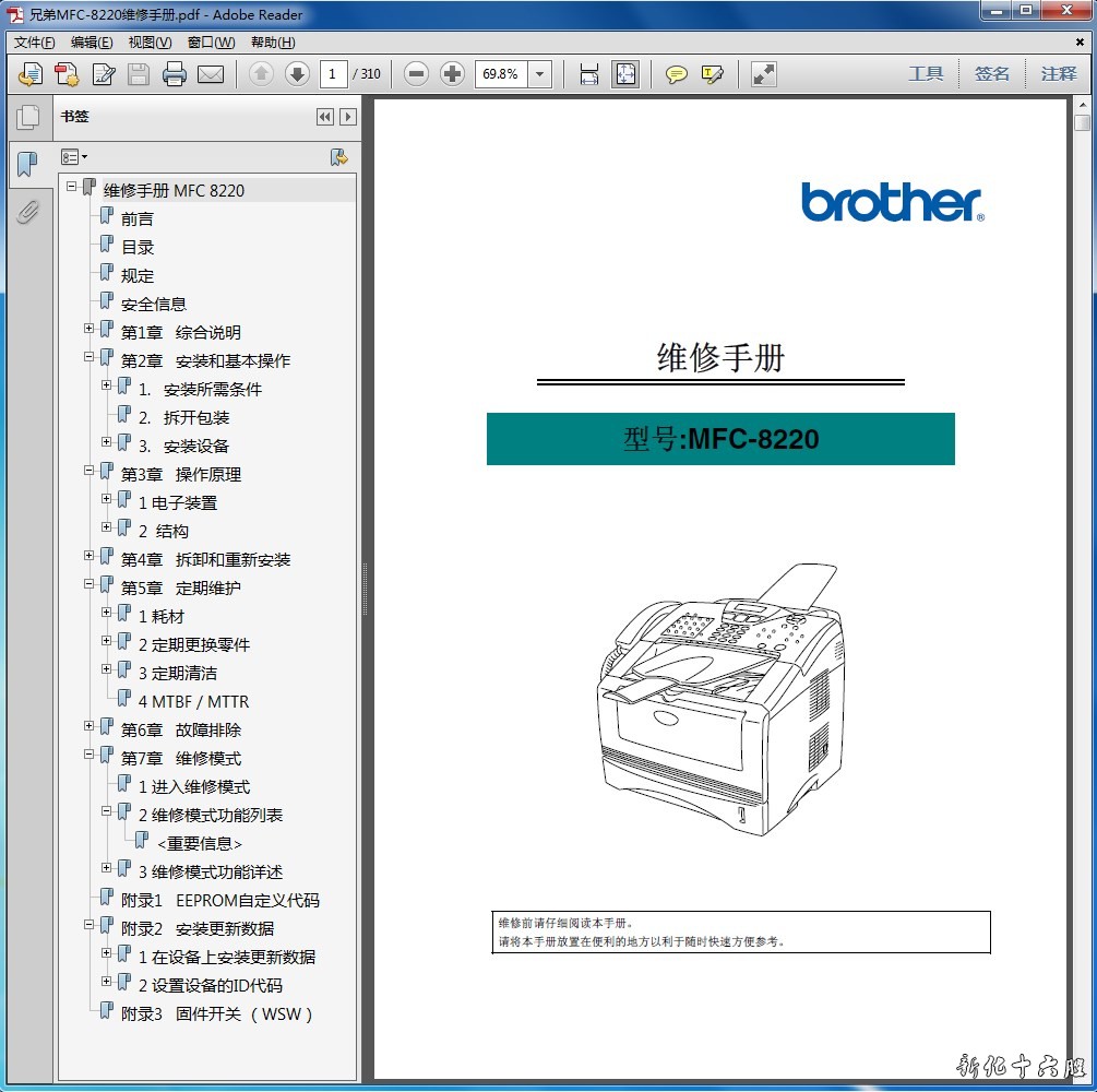 兄弟 MFC-8220激光传真一体机中文查错拆机故障排除维修手册 访客 2018年12月08日 19:03 1 0 语 言:中文格 式:PDF电子版,无加密页 数:310页手册内容详实,图文并茂,是维修人员的好帮手,有了维修手册,这款机子的拆卸、故障排除您就不用再发愁了!即使是普通的用户,也可以根据维修手册解决简单的故障。 链接:https://pan.baidu.com/s/1WbPYns0zLRLO-avjdTe0ow 提取码:xh39 标签: #8220