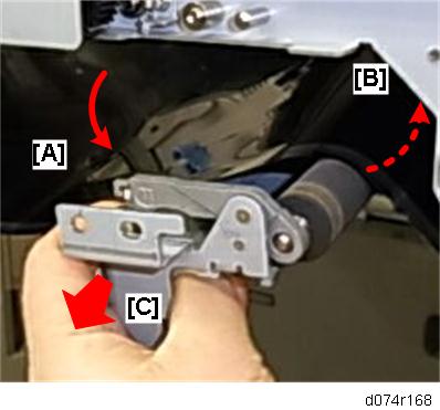 - 缓慢放低皮带张力辊组件[A], 用手托住辊的另一端。