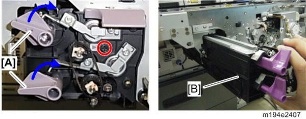 - 按触释放杆[A]并拉出ITB清洁单元[B]。
