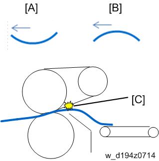 | [A]: 正面定影后卷曲[B]: 反面定影前卷曲(翻转)[C]: 纸张和定影皮带之间接触 | 极易发生的条件: