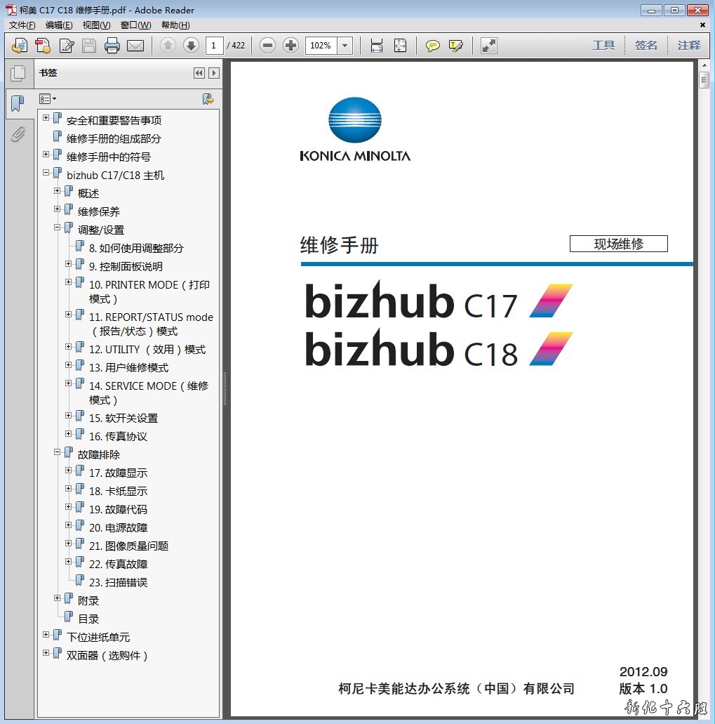 柯尼卡美能达 柯美 bizhub C17 C18 彩色复印机中文维修手册现场维修+操作原理+用户手册语 言:中文格 式:PDF电子版,无加密页 数:422页手册内容详实,图文并茂,是维修人员的好帮手,有了维修手册,这款机子的拆卸、故障排除您就不用再发愁了!即使是普通的用户,也可以根据维修手册解决简单的故障。