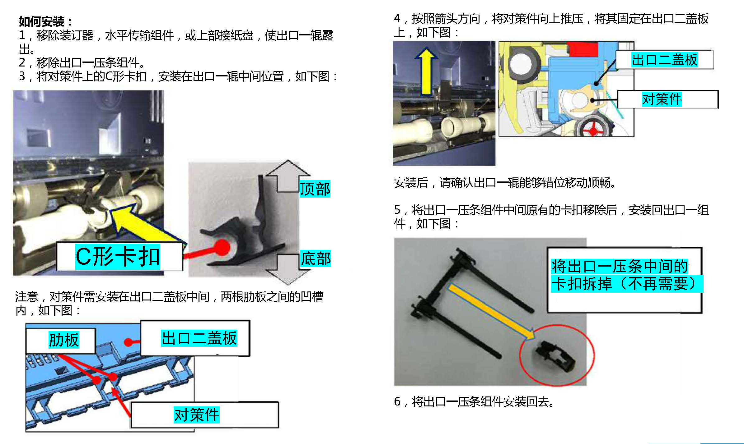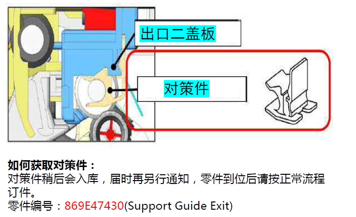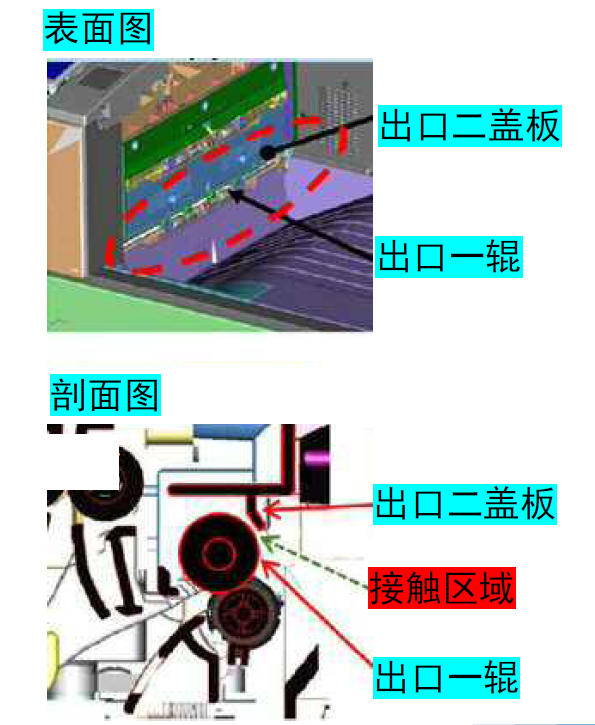 解决办法: 在出口二盖板和出口一辊之间,介入一个隔片,从而防止两者之间的干涉。 如下图,安装此隔片后,出口二盖板与出口一辊之间的间隙得以维持。即使机器在输出大量副本后,出口二内部温度升高,出口二盖板与出口一辊之间也不会再互相干扰,从而避免了噪音的产生。