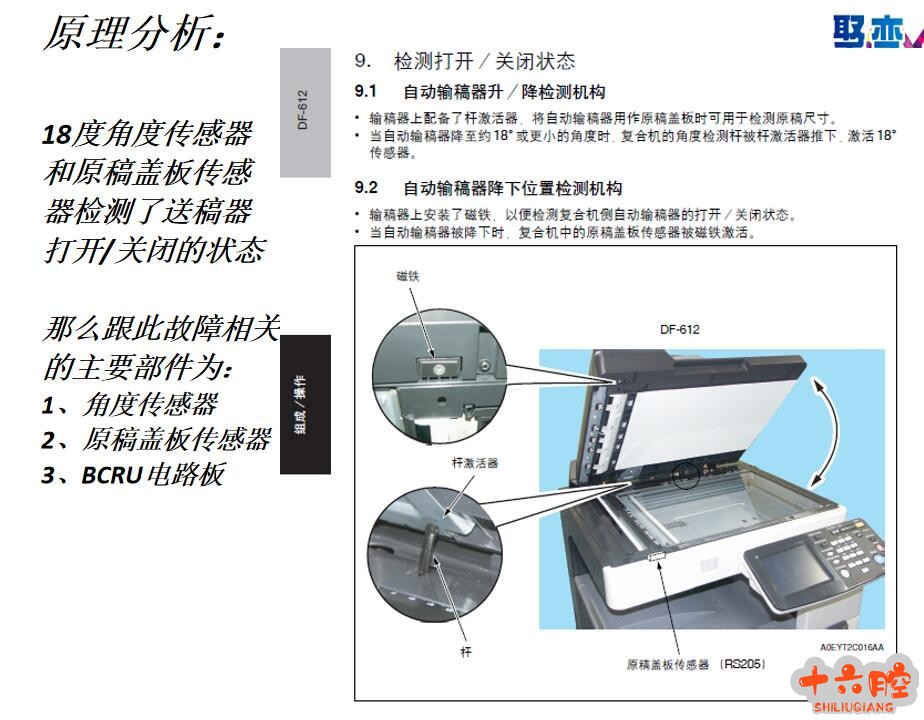 故障现象: 当送稿器DF-612盖下时,稿台下无原稿有时会报稿台下有原稿;而稿台下有原稿又有时检测不到原稿的尺寸 故障分析: 稿台原稿尺寸检测的原理是什么? 1、原稿CD方向通过CCD检测 2、原稿FD方向通过FD尺寸传感器检测原稿检测什么时候开始工作呢? 3、当机器收到送稿器或盖板盖下的状态指令时,那么哪些部件负责反馈这个状态呢? 请大家讨论以上分析步骤?