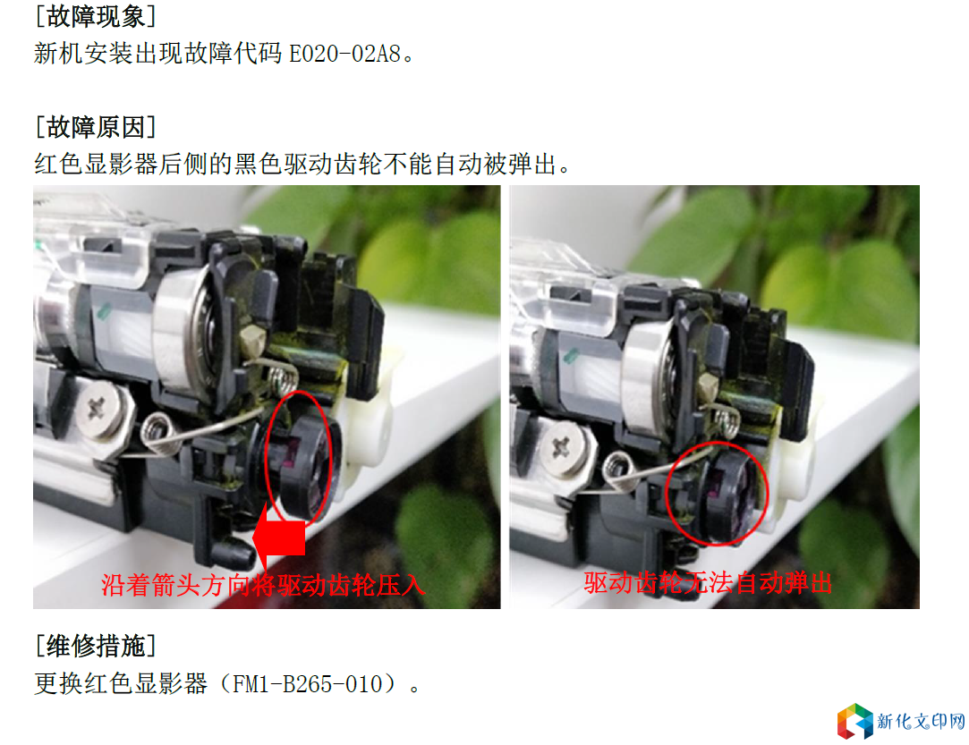 [故障现象] 新机安装出现故障代码E020-02A8。 [故障原因] 红色显影器后侧的黑色驱动齿轮不能自动被弹出。