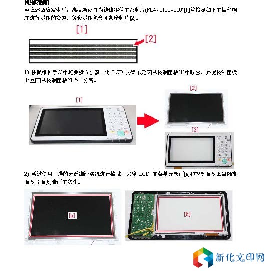 防止外界灰尘进入控制面板组件的对策措施 产品型号: iR-ADV C5535 iR-ADV C5540 iR-ADV C5550 iR-ADV C5560 [故障原因] 将控制面板上盖[1]与触摸面板粘合在一起的双面胶带之间存在一定的缝隙[a];外界灰尘可以经由该缝隙进入控制面板组件内部,进而导致上述故障的发生。