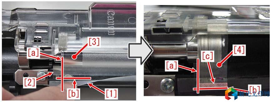 3) 将侧端密封条连接到显影组件的前端 3-1) 在将树脂片[1]轻轻向外压下的同时,以树脂片[1]的边缘和显影套筒[3]的边缘[a]为安装基准将侧端密封条[4]上的较小的粘接面积[c]进行黏贴。 [参考] 显影组件前端侧端密封条的安装参照基准与后端不同,主要区别是使用显影套筒[3]的边缘代替了树脂片[2]的边缘。