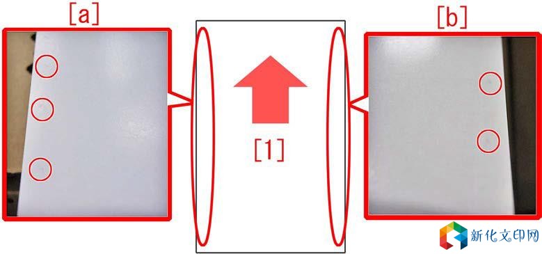 iR C3020\3025 iR-ADV C3330\3325\3320\3320L iR-ADV C3530\3525\3520 [故障现象] 当打印宽度大于305mm 的大纸时,在纸张[1]的前边缘[a]/后边缘沿箭头指示的纸张输送方向可能出现条纹和脏污。