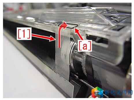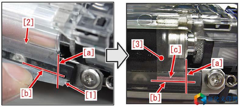 1) 将出现故障的显影组件从主机上拆下。 2) 在显影组件的后侧安装侧端密封垫 2-1) 在显影组件上有两条树脂片([1]和[2])。在将树脂片[1]轻轻向外压下的同时,以树脂片[1]的边缘和树脂片[2]的边缘[a]为安装基准将侧端密封条[3]上的较小的粘接面积[c]进行黏贴。