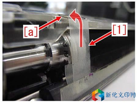 [维修措施] 当出现上述故障时,需要准备新设定为专用维修零件的侧端密封条(FL1-7769-000),按照如下的操作步骤在每支显影组件上安装2 片侧端密封条。 [说明]如下图所示,从侧端密封条背面拆下背衬纸时,可看到较大的粘接面积[a]和较小的粘接面积。