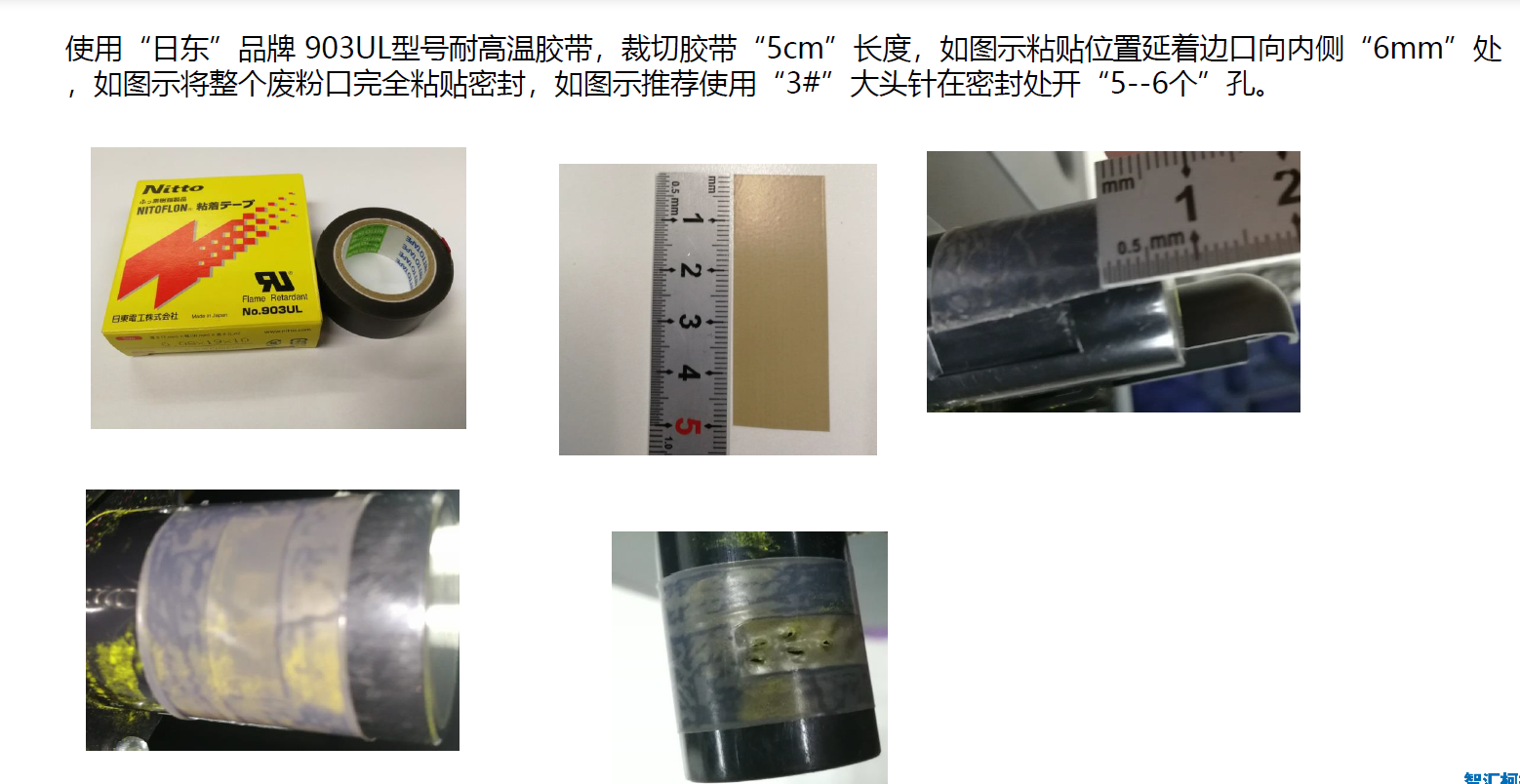 故障原因: 1. 由于覆盖率太低显影仓内的碳粉变质(磁性减弱),导致显影磁辊无法抓住碳粉,发生喷粉现象,同时变质的碳粉大量从显影仓废粉口排除,使得载体被一并排除。 2. 设备处在极端的温湿度环境中工作[比如高温(30℃以上)高湿(70%以上),低温(10℃以下)低湿(20%以下)] 3. 主机前后有倾斜,主机水平不良。 解决方法: 1. 低覆盖率打印时,需要调整软开关设置。 DIPSW 104-7 =0(默认) 防止过度的碳粉供应 DIPSW 104-4 =1 提高显影仓的运送能力 DIPSW 104-0 =1\DIPSW 104-1 =1 碳粉带创建(Y M C K = 5%) DIPSW 103-7 =1 当更换了DIPSW104-0/1后必须更改 按照以下操作,在Y M C K每个显影仓的废粉口粘贴胶带,并使用3#大头针开5—6个孔(如图)