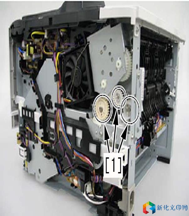 8) 关闭前盖板、转动齿轮到能够拆除定影器的位置、拆除齿轮[1]3 个。