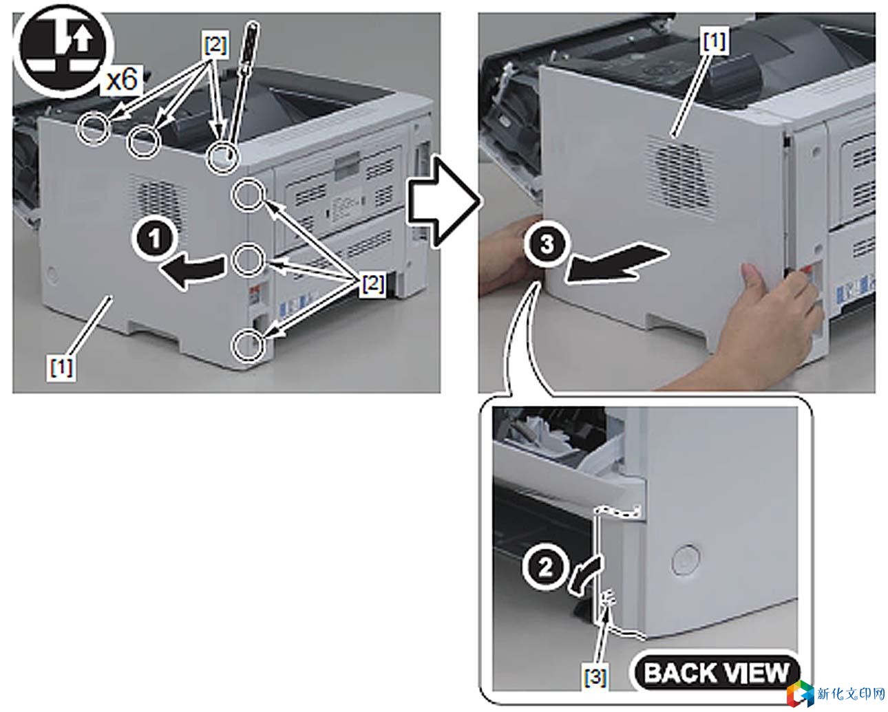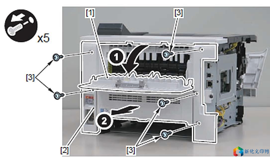 6 )打开后盖板[1]、将后盖板组件[2]和双面搬送组件一同拆除。 ・ 螺丝[3] 5 颗