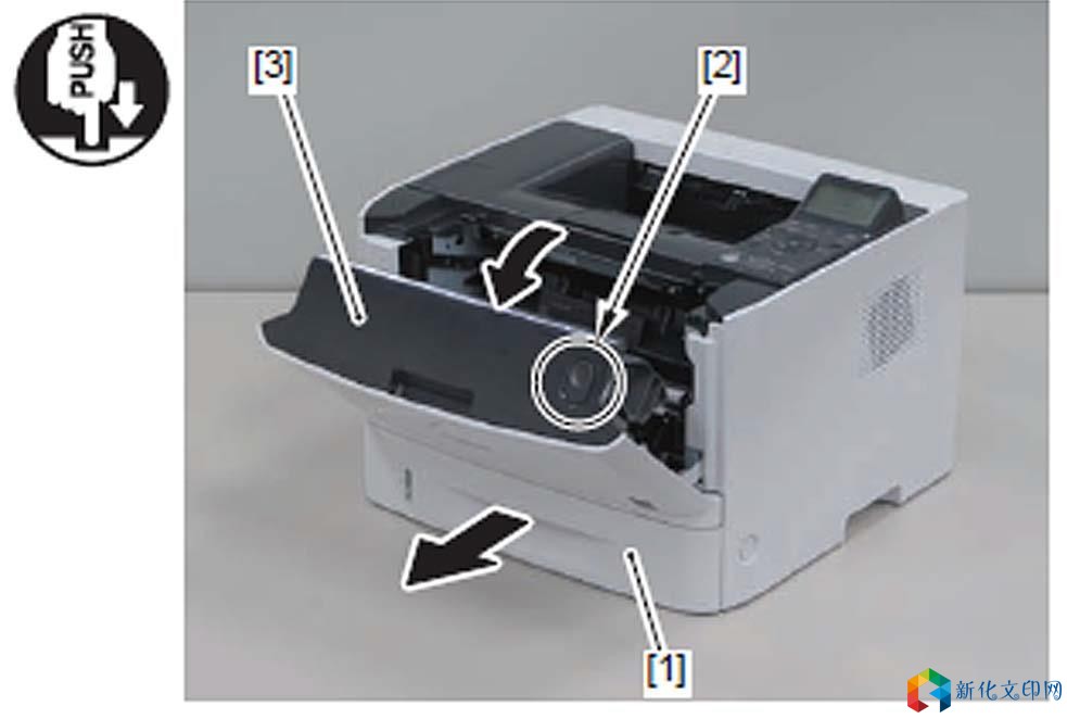 【原因】 在低湿环境下纸张搬送时纸张同搬送导板肋条摩擦产生静电,从而导致上述现象发生。 【维修上的处理】 如发生上述现象、请准备新型号的转印排纸刺轮C (FE8-9181-000),并按照下面步骤进行作业。 1)取出纸盒[1]。 2)按OPEN 按钮[2]、打开前盖板 [3]。