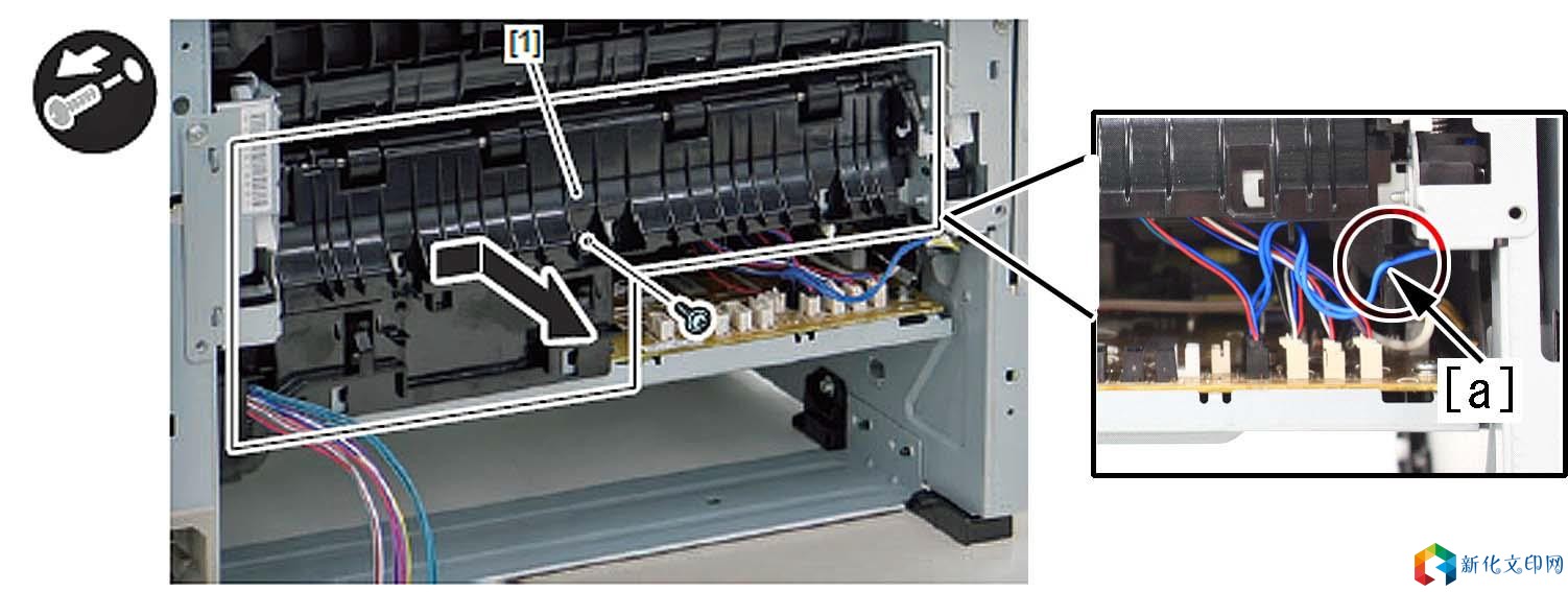 11) 将线束[a]从线槽中取出、左右晃动搬送导板 [1] 并取出。 ・ 螺丝 1 颗