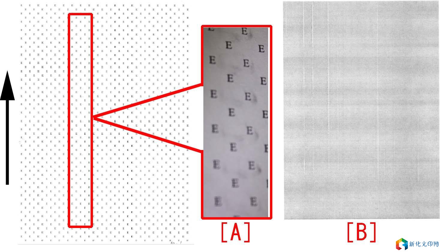 【内容】 文字周边出现墨粉飞散的图像或者出现白条的对应。 【现象】 纸张在搬送导板肋条处出现如下图【A】一样的文字周边墨粉飞散、或者是像【B】一样的半色调图像上出现白条。箭头为走纸方向。
