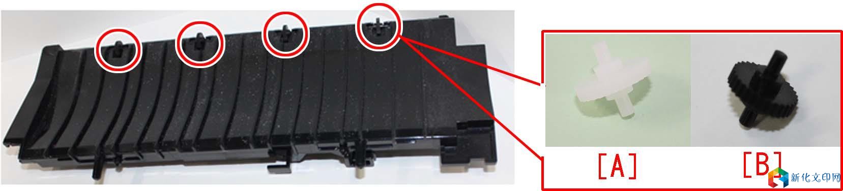 16) 更换新型号的白色转印排纸刺轮。 图片[A]为新型号,[B]为旧型号。 |