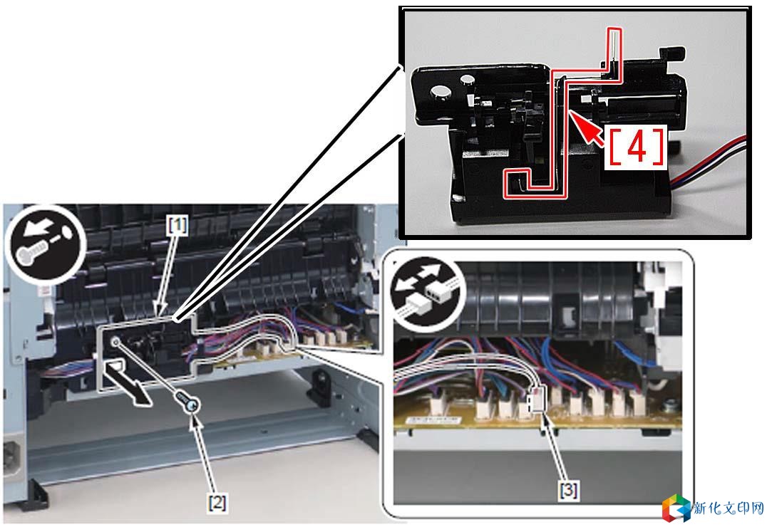 9) 拆除线束、拆除双面翻转传感器组件 [1]。 [注意]双面翻转传感器组件[1]上附带的弹簧[4]不用拆除。 ・ 螺丝[2] 1 颗 ・ 插头[3] 1 個