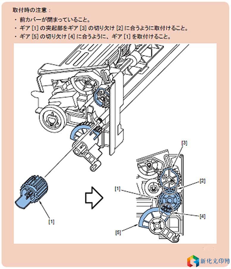安装时的注意: -关闭前盖板 -安装时齿轮【1】的突起部分和齿轮【3】的缺口部分【2】 需要位置对准重合 -将齿轮【5】的缺口部分【4】位置对准重合安装齿轮【1】