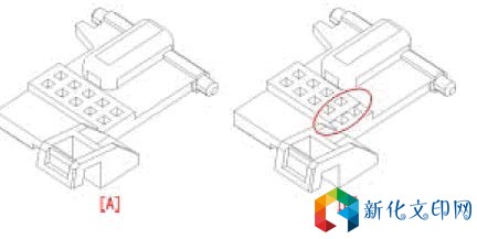 [A] 纸张输送方向 原因:当插入硒鼓时,接地接触片[1]没有充分推入,使得连接高压电源板的线缆接头接触不良。