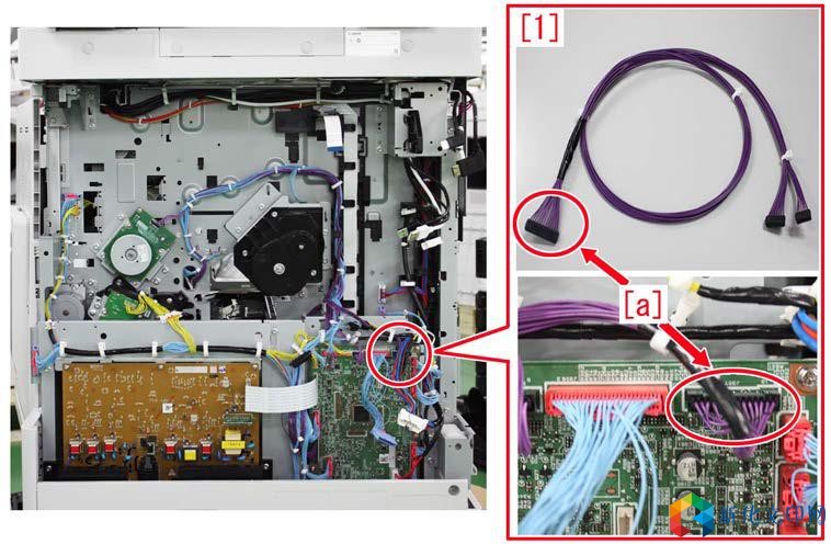 [参考] 下面照片是机器拆下后盖和控制器盒后的照片,定影控制线缆[1]的连接器[a]连接到位于右下角的AC 控制器PCB 上。