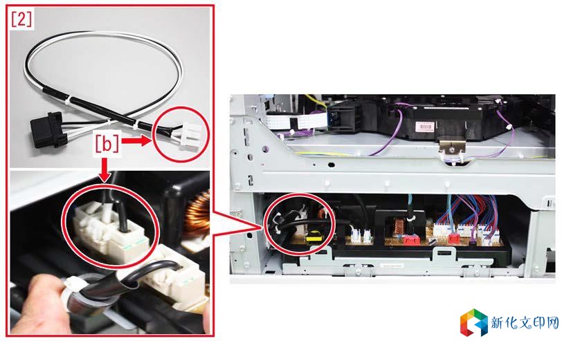 下面图片是拆下机器左盖板和左下盖板后的照片,定影加热器交流电缆[2]的连接器连接到交流驱动板PCB 上。
