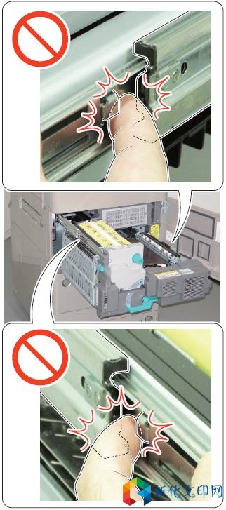 原因 当定影组件顺着滑轨推入时,需要格外小心,因为手指可能会被轨道的锁夹住,请遵循以下步骤推入定影单元。 • imageRUNNER ADVANCE 6075/6065/6055 系列 • imageRUNNER ADVANCE 6275/6265/6255 系列 • imageRUNNER ADVANCE 6575/6565/6555 系列 详细说明 注意:当推入定影组件时按下释放弹簧时,缓慢的推动固定进给装置,这样手指就不会被夹住。