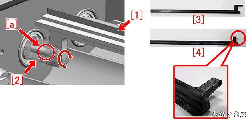 [样张2] 故障原因: 当搅拌板[1]与容器接触时,作用力集中到凸台的底座上,凸台与20T 齿轮[2]连接。重复的作用力可能导致搅拌棒断裂,墨粉不再搅拌或未供应,导致上述现象。如下图所示为20T 齿轮与搅拌杆、普通搅拌杆[3]及破碎搅拌杆[4]的照片。