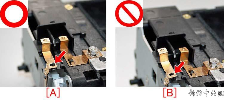 [注意]在安装金属薄板时,要确保滚子偏压板与凸台的配合正确。 [A]定位销偏压板位置安装正确,[B]定位销偏压板安装不到位。