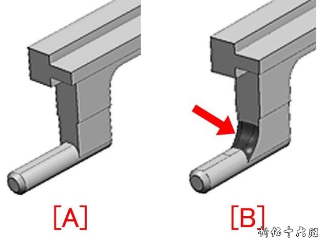 12) 从步骤5)倒叙重新安装零件。 工厂对策 将显影器中的第二、搅拌棒改为新型搅拌棒,加强了其凸台的基础。图[A]为旧型凸台底座,[B]为新型搅拌杆凸台。