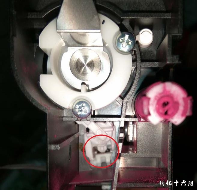 红色圈内有个弹簧丢失 [维修措施] 从废旧鼓上拆了一个弹簧装上后故障排除。 |