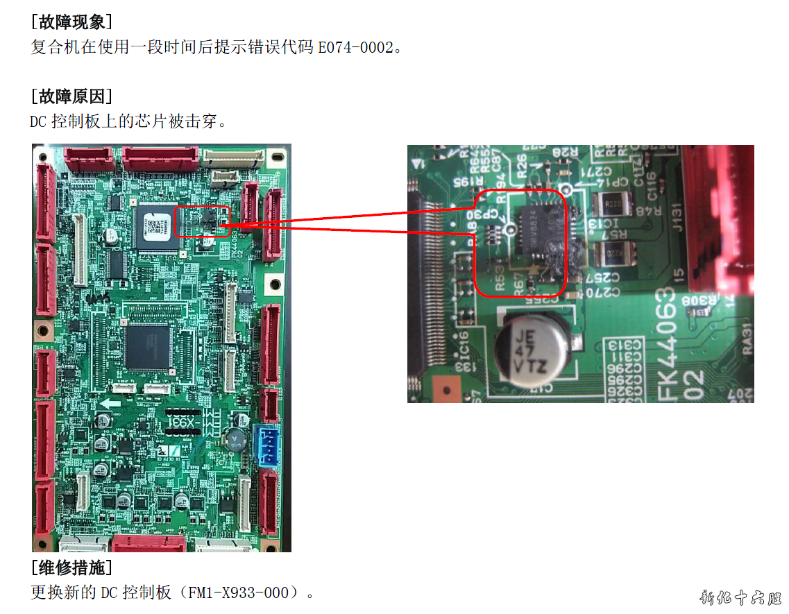 [故障现象] 复合机在使用一段时间后提示错误代码E074-0002。 [故障原因] DC 控制板上的芯片被击穿。