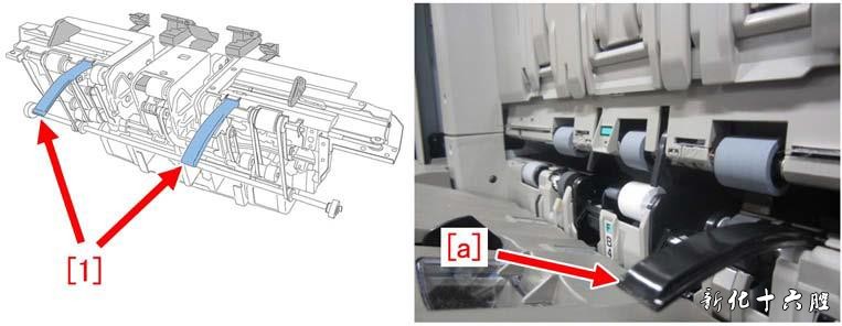 6) 以相反的顺序将从步骤5)开始拆下的零件重新装回。 [工厂对策] 通过修改托盘辅助导轨前缘[a]的尺寸,防止副导轨[1]被卡住。