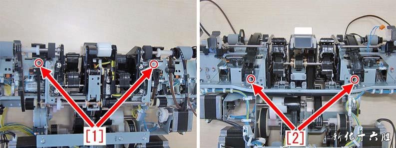[维修措施] 当出现上述故障时,准备前侧副导轨组件(FM4-4744-000)和后侧副导轨组件(FM4-4746-000), 并按照如下操作步骤进行托盘辅助导轨部件的更换。 1) 按照维修手册内容的指引将处理托盘单元拆下。 2) 将前侧准直板[1]和后侧准直板[2]向箭头方向移动,然后移除螺钉[3](x8 颗)。
