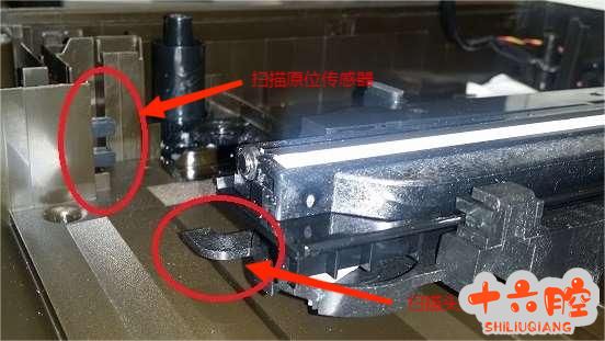 3)确保扫描头上的触发挡片可以挡在原位传感器之间(如下图)