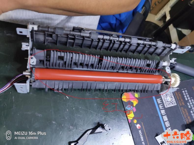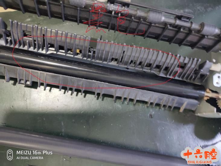 解决过程: 经检测确认纸张设置和驱动无故障;首先升级固件和更换硒鼓无效;考虑齿轮组、马达和驱动板故障,更换依旧无效;无法确认故障点,替换主板、电源板、进纸组件、扫描平台等无效。 拆机发现客户加热组件压力辊颜色不对,具体如下图: