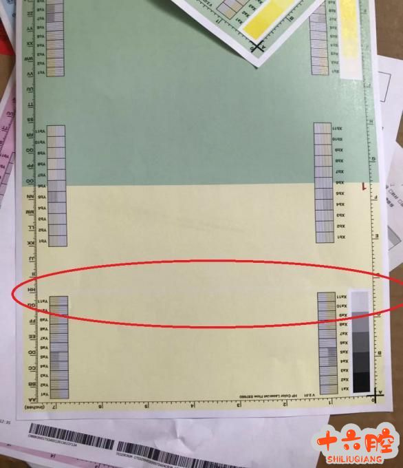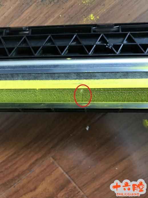 解决过程: 打印PQ页发现黄色有一条白道,平行于纸张短边的(长边进纸),判断可能和鼓组件、显影或者激光器有关系,拆下感光鼓检查未发现异常,拆下显影发现磁棍上有一条载体特别少的一条,拆开看载体还比较多,然后拆开磁棍上的刮板看上面有一个小的纸削,清除纸削上机测试正常。