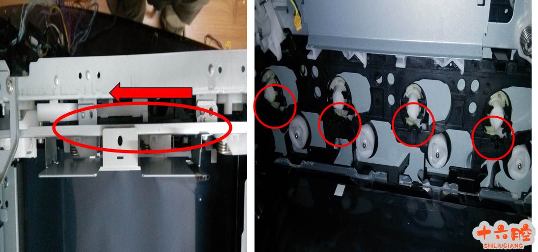 如何检查齿轮组是否到位? 用手动转动马达左边第一马达逆时针转动,观察两点:齿轮组最上端黑杆是否能带动前后移动(这步最关键)如果无法转动可能原因是齿轮组没有和机器咬合在一起,需要重新安装。再查看齿轮组显影轮是否一致同时转动。请看图: