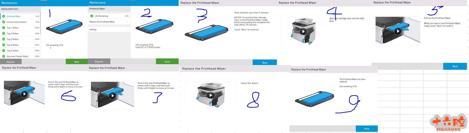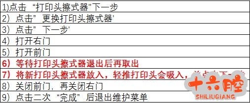 1. 打印头擦拭器是唯一在固件控制下更换的长寿命备件 2. 在更换过程中,可能会造成擦拭器损伤 3. 这意味着,擦拭器两侧的驱动齿轮可能会断齿 4. 受损的打印头擦拭器,使用寿命会缩短 5. 打印机会驱动打印头擦拭器移动到右侧,以检测擦拭器的使用情况,并转动清洁布向前移动 6. 受损的擦拭器无法移动到右侧,会提前停下来 7. 在这种情况下,打印机会提示信息:打印头擦拭器已经用完,必须被更换 8. 如果擦拭器受损,工程师需要打开墨水存取盖,手动驱动 (T20),使擦拭器从右侧门移出。这有些费力。 a) 拆除后,你需要手动安装擦拭器,驱动回原位。或者打印机开机,按照指导流程重新安装擦拭器。 9. 在拆除 / 安装擦拭器时,建议运行服务菜单下的打印头擦拭器诊断功能。 |