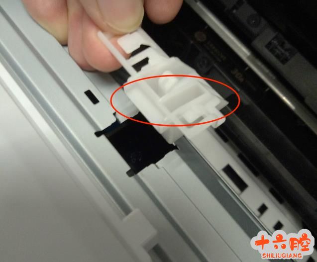 正确的位置,圆圈内正常位置,当关上硒鼓盖后,黑色塑料杆被压下,激光器上的挡片被抬起,否则打印机会提示52错误。