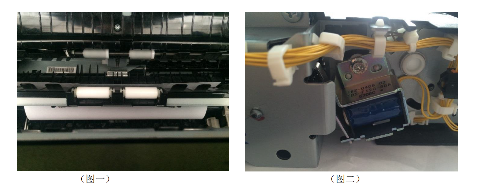 【故障现象】: iRAC5235 新机器,发现从第一纸盒输出A4 纸,不定期会从二纸盒走一张A3 纸,图像输出A4 和A3纸分别占一部分,然后卡纸,卡纸代码是0213。清Dc-con,MMI,清洁高压触点,接地线等未能解决 【故障分析】: 1. 进纸离合器是一个拉动释放挂勾释放驱动搓纸轮的齿轮运转后才能正常搓纸,正常情况下,进纸离合器是给其供电后才有吸合的动作。怀疑静电无法正确排放,导致不定期进纸离合器的突然性吸合。但机器加了接地线后,理论上机身上的静电已经排除,不会产生进纸离合器的吸合 2. 通过判断,如若机器持续给进纸合器供电,进纸离合器一直为释放状态,那么搓纸轮会持续搓纸,但机器单张走纸都正常,故进纸离合器损坏的可能性最大 【维修过程】 3. 机器最初开机正常,无其它异常,只有偶发A4 与A3 重叠后卡纸,卡纸代码0213 4.怀疑机器的系统是否存在问题,下载最新的系统固件进行升级,升级后,机器开机就报卡纸,发现第二纸盒出纸位置卡纸(见图一) 5. 把卡纸取取,关闭侧门下面的小侧门,机器有搓纸动作后又报卡纸,卡纸的位置与上一张纸相同。连续尝试三四次,卡纸位置没变化,卡纸代码0213,从故障判断,就是进纸离合器(图二)故障。