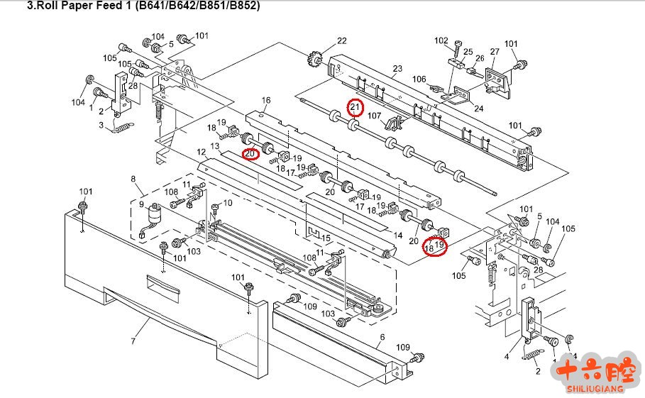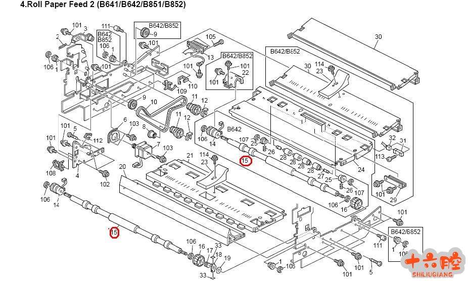症状 一台机器复印/打印标准尺寸图纸时,经常会出现图纸尾端会短2-3CM 的现象。 原因 纸卷输送器单元送纸迟滞。 维修过程 现场维修措施: 1)现场通过手送台进行复印大尺寸标准图纸时,副本图纸正常。分别选择卷纸1 和2 进行复印/打印标准A1,A0 尺寸图纸时,副本图纸均出现尾端短2-3CM 的现象,初步判断问题是在纸卷输送器单元。 2)分别调节纸卷输送器的卷纸1 裁切长度调整SP1920-111 和115。同时调节卷纸2裁切长度调整 SP 1920-211 和215. 由于裁切长度误差过大,故障仍然依旧. 3)调节纸卷输送器电机皮带的张力,以及更换新的纸卷输送器电机和张力支架,并且更换新的纸卷1 ,2 的送纸离合器 ,故障仍然依旧. 4)更换新的裁切单元, 故障仍然依旧. 5) 通过更换纸卷1 ,2 的送纸轮以及从动轮.(详见下二图中红圈的零件),故障现象消失.