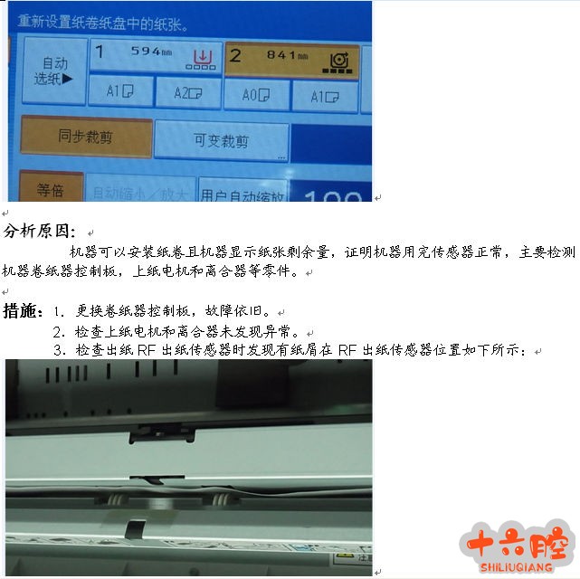 4.取出RF 出纸传感器上纸屑,故障解决。 故障原因: 机器切纸刀磨损严重不能正常切纸,经常在切纸后会留有纸屑在RF 出纸传感器位置。 解决方案: 清除纸屑,更换切纸刀 |
