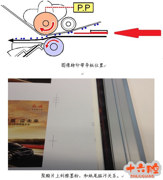 图像转印带(ITB)导板上的聚酯片有轻微变形,较厚较长纸张通过时会挤压到此处, 导致聚酯片上翘,触碰到图像转印上的墨粉图像区域,污染纸张边缘。
