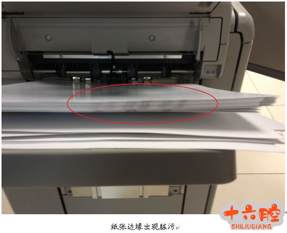 症状 用户打印256~300g/㎡ 大于A3 长度的纸张时,发现印品尾端有脏污现象。打印小于256 g/㎡ 或比A3 长度短的纸张时正常没有此脏污现象。 原因