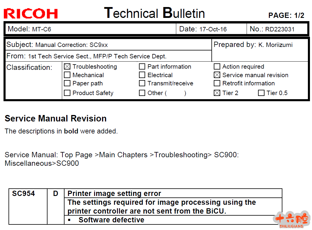症状 MP9003出现SC954。 维修过程 1.机器出现SC954故障代码,重启机器无效,检查维修手册,未找到该故障代码的相关说明; 2.检查该系列机型的RTB,在RD223031中找到相关说明;
