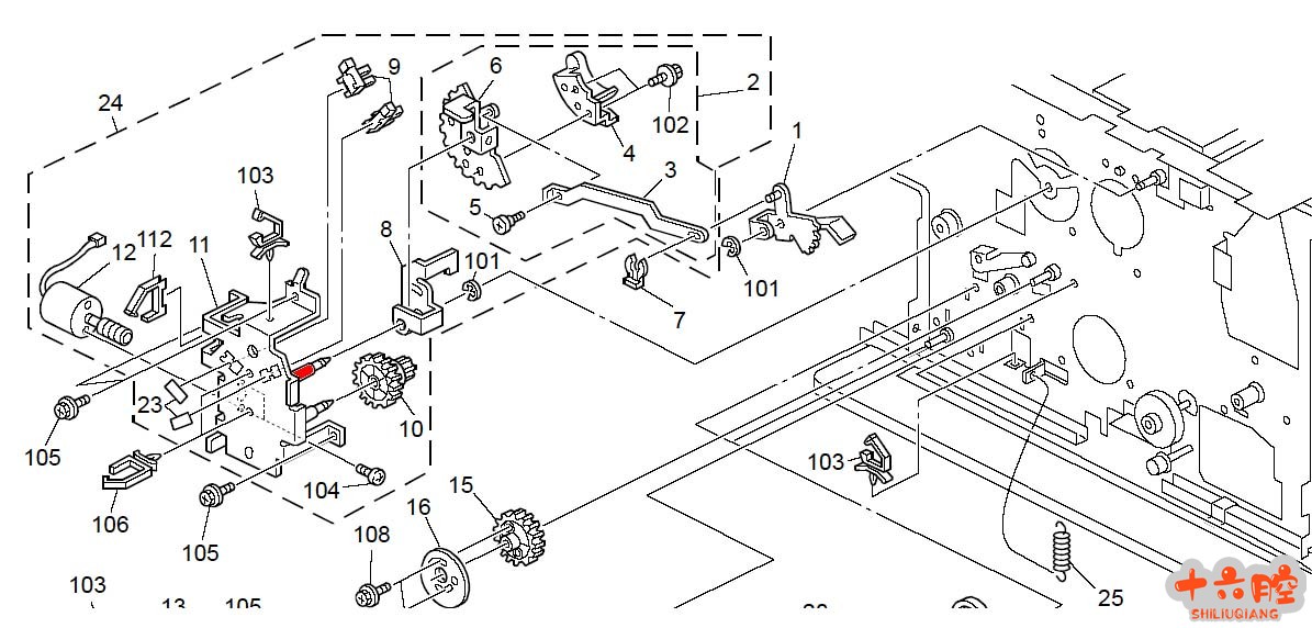 解决方案 1. 如果凹痕较浅,可用锉刀打磨平整后,涂黄油润滑继续使用。 2. 如凹痕较深,建议更换版夹开关机构组件,上图 24 号零件。 3. 更换新的零件后,此部位仍需涂油脂润滑,防止再次出现磨损。 |