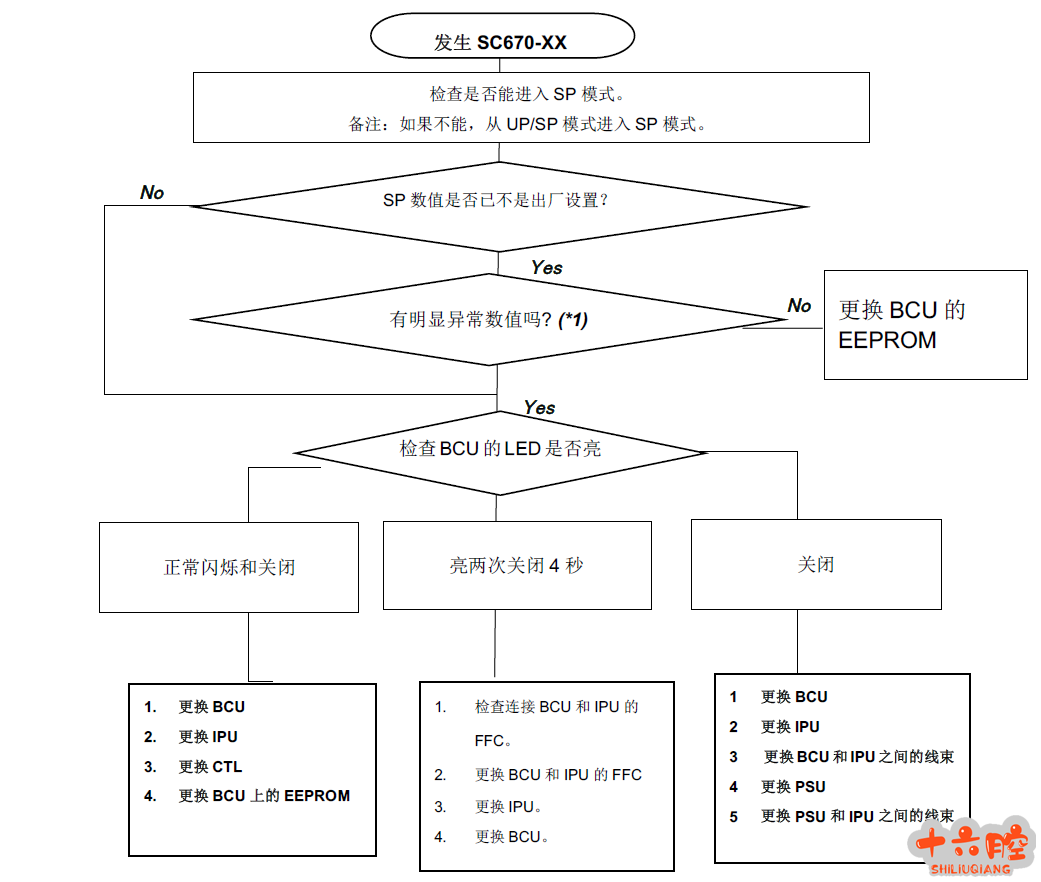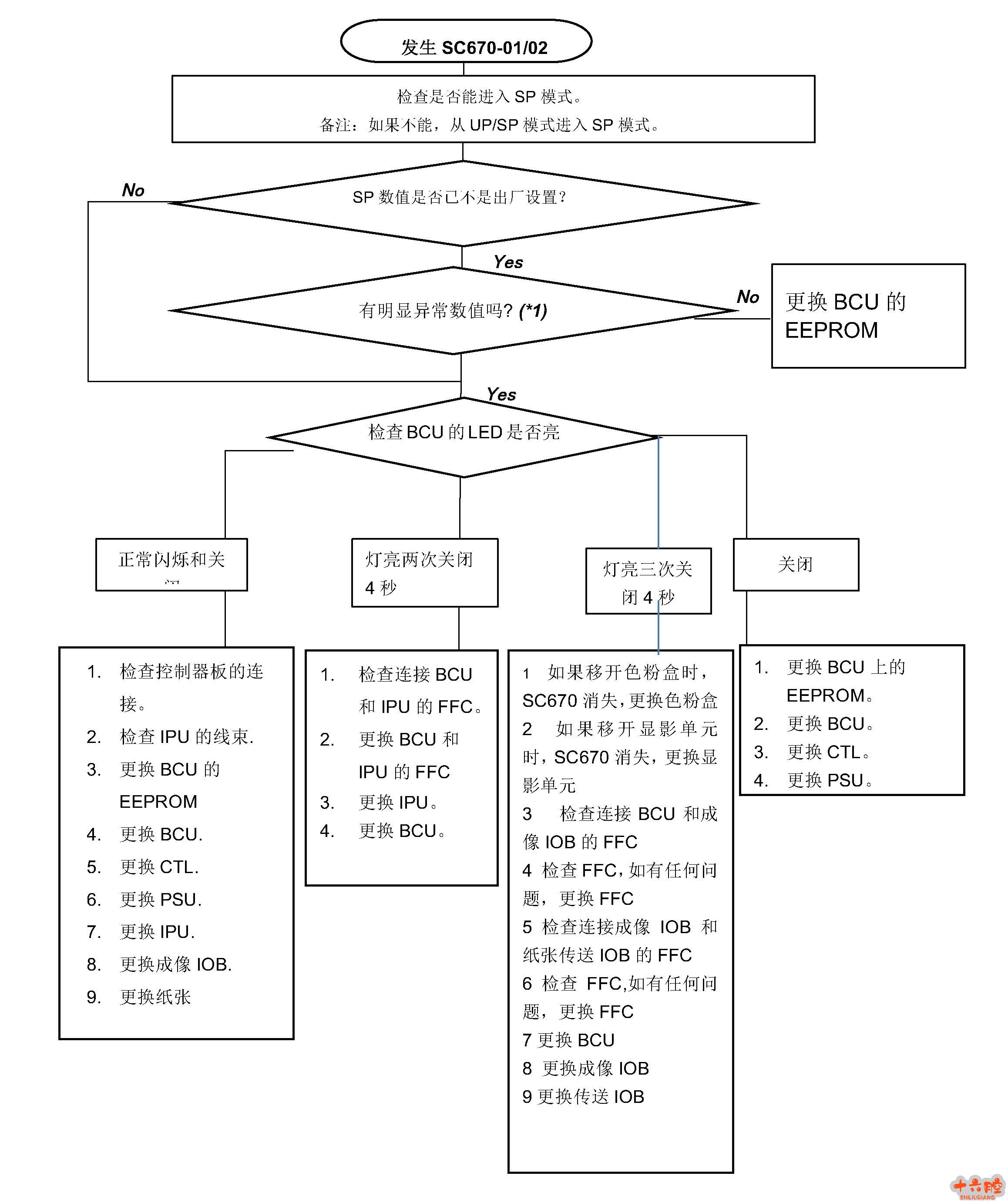解决方法2 如果发生问题,运用以下流程图查看原因,确定操作. 注释: BCU 板LED 灯亮3 次的措施删除,转为SC664 和SC665. SC665-02 1. 如果取下粉瓶,SC665-02 消失,更换粉瓶。 2. 如果取下显影单元,SC665-02 消失,更换显影单元 3. 更换连接BCU 和成像IOB 的FFC. 4. 更换成像IOB 和传送IOB 的FFC. 5. 更换BCU. 6. 更换成像IOB. 7. 更换传送IOB. 8. 更换4 个ID 芯片 SC665-03 1. 更换成像IOB 和传送IOB 的FFC. 2. 更换成像IOB. 3. 更换传送IOB. SC665-04/SC664-01 1. 更换连接BCU 和成像IOB 的FFC. 2. 更换连接成像 IOB 和传送IOB 的FFC. 3. 更换BCU 的EEPROM. 4. 更换成像IOB. 5. 更换成像IOB. 6. 更换BCU. 解决方法3 如果发生问题,运用以下流程图查看原因,确定操作. 正常闪烁和关闭 1. 检查控制器板的连接。 2. 检查IPU 的线束. 3. 更换BCU 的EEPROM 如果发生问题,运用以下流程图查看原因,确定操作.